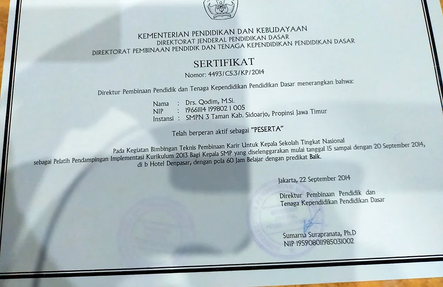 Sebagai peserta pada kegiatan Bimbingan Teknis Pembinaan Karier untuk Kepala Sekolah Tingkat Nasional, sebagai pelatih pendampingan implementasi kurikulum 2013 bagi Kepala SMP yang diselenggarakan oleh Direktur Pembinaan Pendidik dan Tenaga Kependidikan Pendidikan Dasar, mulai tanggal 15 sampai dengan 20 September 2014.